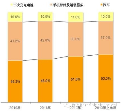 比亚迪拥有汽车、“手机部件及组装”和“二次充电电池及其他”三大业务,虽然2013年其手机业务销售稳定,太阳能业务亏损的收窄对其净利润均有影响,但其汽车业务对净利润影响因素较大。最近几年来,比亚迪汽车业务早已成为其营收占比最大的业务。