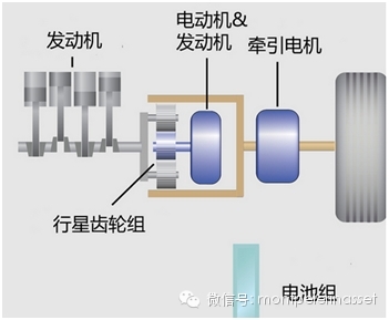 丰田发展混合动力汽车很早,发展出一套采用行星齿轮动力分配机构的混合动力模式。这套模式包含两个电机、一个发动机,一个行星齿轮动力分配机构,而核心是这个行星齿轮动力分配机构,可以巧妙的让三者构成并联——发动机和电机一起驱动车辆,或者串联模式——发动机发电,一个电机充当发电机,另外一个充当电动机驱动车辆。而这个动力分配机构是有专利的。