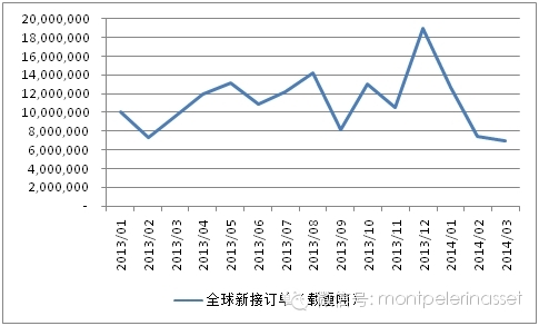 虽然新一轮周期已经开启,但仍处于前期尾端运力的收缩阶段,供给仍然大于需求,离航运业真正的景气阶段还有一段距离。2014年1—3月全球新接订单有所回落。2014年1月份全球新接订单为1269万DWT,同比回升10%,环比回落43%。2014年2月全球新接订单为743万DWT,同比回升1%,环比回落41%。2014年3月全球新接订单为692万DWT,同比回落27%,环比回落7%,回落速度较1、2月放缓。近期,全球新船订单偏少,应与航运市场较为疲软、前期订船需求释放较多、航运市场仍处于供过于求状态有关。P3联盟成员之一达飞公司日前表示,未来3年公司没有新船订造计划,以便消化现有运力。
