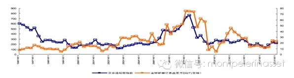 根据申银万国的研究,观察造船行业景气度的指标主要有四个:新接订单、新船造价、手持订单、交付订单。新接订单与股价的拟合度好,关系最为密切,因此可以由新接订单的长期未来趋势预测股价的长期未来趋势。这一点很类似房地产,2011年以来,房地产股价走势领先于新建商品房销量,销售已成为最主要驱动因素,而非结算业绩。