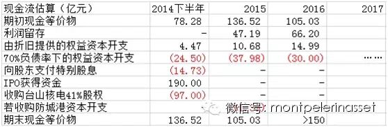 由上表可知,公司2014年6月底约有78亿元现金,在建机组数量高达9台,收购台山核电股权也将花费大笔现金,这也成为公司资本开支最大的一年,同时在运机组仅为11台,经营活动产生的自由现金流难以支撑较大规模的资本开支,此时顺利进行IPO募得大量资金保证了公司后续发展,在维持目前70%资产负债率的前提假设下,考虑各项现金收支后预计年底约有现金135亿元。