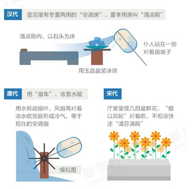 古人避暑最为高效的方式就是建造纳凉的“空调室”这种房间是通过现在讲的空气动力学精心设计的,有完整的风力循环系统,在风口会放置冰盆、花卉,这样就会通过风的循环产生冷气,并且伴随花的清香。同样,古人还会借助水流产生动力,制造“扇车”类似于咱们现代的电风扇,产生风。这种“风水”是我们祖先对生活智慧的创新与总结,绝非迷信糟粕!