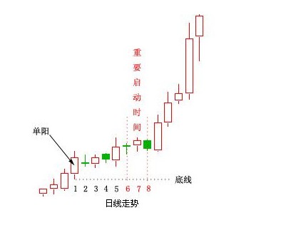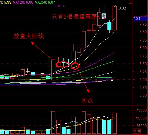 接下来再讲讲一种攻击力很强的K线形态,说这种形态是抄底形态有点不合适,但由于出现这种形态后,后面的涨幅往往巨大,那么买点相对来说就是底部。