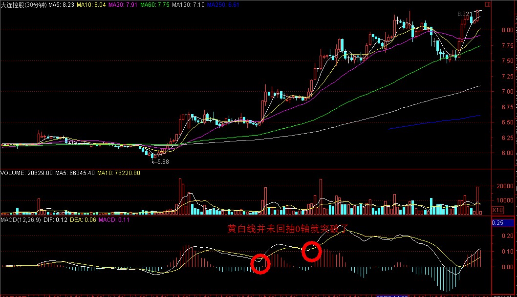 一般来说,当30分钟MACD符合上述条件后,没有有效突破,我们也不会亏损,此时切换至60分钟MACD,继续等待上述过程,这次突破的概率就会大大增加,如果这次也没有有效突破,我们仍然在高点附近卖出,也不会亏损。此时横盘震荡的K线数目往往已经超过了8根,后面是否会有效突破就值得怀疑了。如果怕错过,还可以切换到日线MACD,继续重复上述方法。