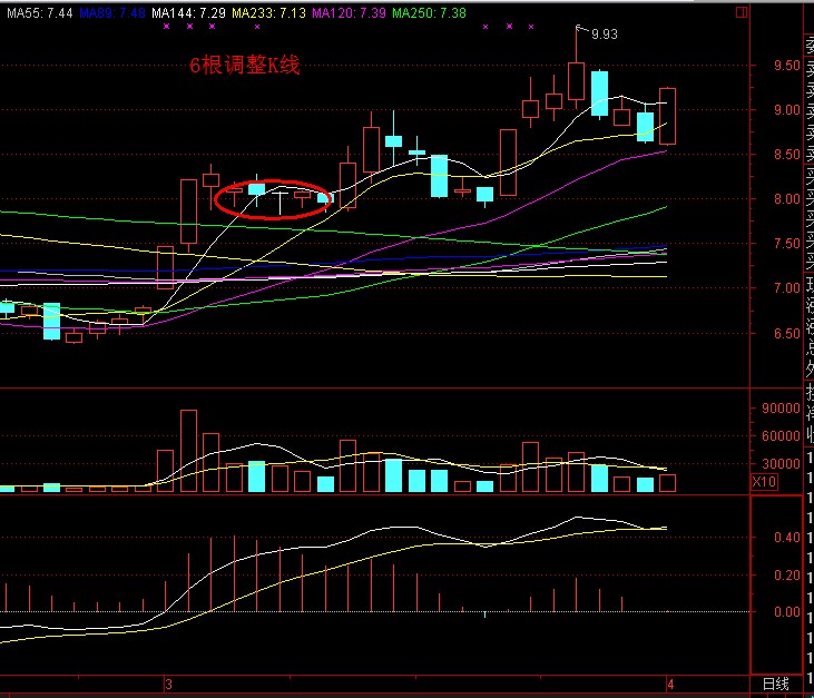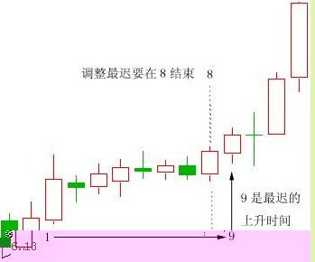 2. 之后之后跟着几根横盘震荡K线,横盘K线最好不要超过8根