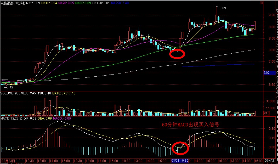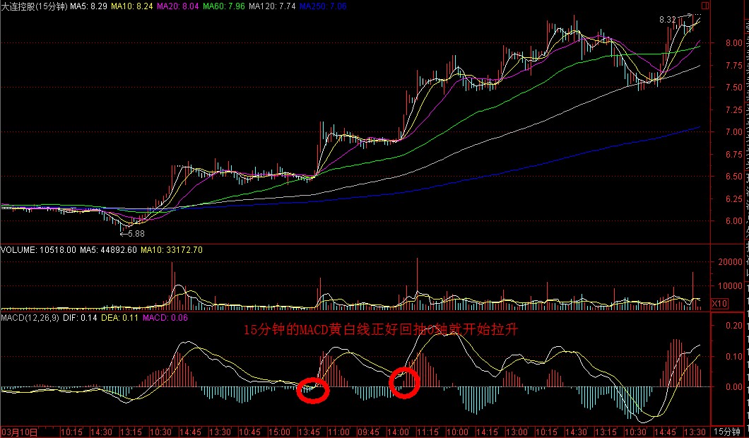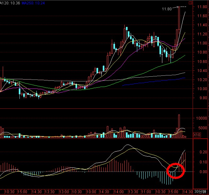 这种方法就是用60分钟或者30分钟的MACD。当出现一根放量大阳线,并且接下来的3-4天都是窄幅震荡,不破阳线底部时,就要瞪大眼睛,打开30分钟的MACD,看MACD的黄白线是否回抽0轴附近,当MACD的黄白线回落至0轴附近,并且绿柱子开始明显缩小时,就可以买入。一旦买入后3天内不能有效突破,或者股价快速拉升至大阳线高点附近两个小时内不突破则一定要卖出。然后再打开60分钟MACD,重复上述过程。