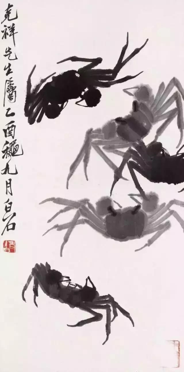 白石老人喜欢画螃蟹,也非常喜欢吃螃蟹。一日与家人吃饭,先生忽然停箸,敛气凝神地盯着盘中螃蟹,若有所思。