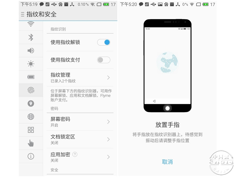 再就是指纹识别,在识别速度以及精准度方面我无话可说,也无从挑剔,但是识别环境和条件就比较苛刻了,MX5犯了和iPhone一样的问题,那就是只能在收支比较干燥的情况下才可以顺利完成解锁,如果手指上有汗水那解锁几乎是不可能实现的。