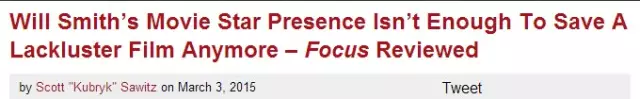 2月27日上映的威尔·史密斯新片《焦点》(Focus),虽然开画便登上周末票房榜首,但也仅收获1910万美元,在威尔主演的电影中排名倒数第一。这个成绩,跟十年前同期上映的《全民情敌》首周末4314万相比,连一半都不到。