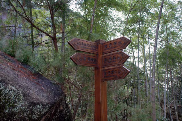 “钓桥庵”是“汤岭古道”进入黄山重要的岔口,标志牌指示右行通往天海,左行通往南大门汤口。