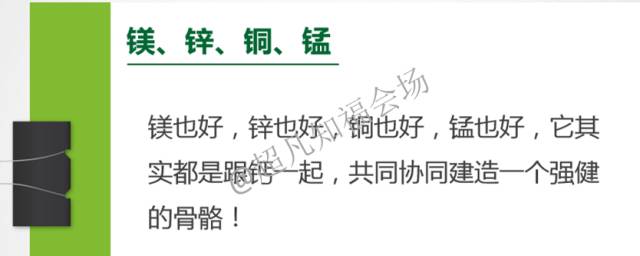 那就是说它必须是复合在一起,来共同的建立一个强健的骨骼,大家不要小看,你比如说铜,可能我们生活当中见到的使用铜的机会,其实并不多,但是如果缺铜这个人也容易骨质疏松,缺锌也容易导致骨里面的蛋白质合成不良,这些都不能忽视。然后我再接下来再跟大家说关于钙的一些重要的沟通要点。