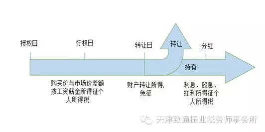 员工接受实施股票期权计划企业授予的股票期权时,一般不作为应税所得征税;员工行权时,其从企业取得股票的实际购买价低于购买日公平市场价的差额,按“工资、薪金所得”适用的规定计算缴纳个人所得税;员工将行权后的股票再转让时获得的高于购买日公平市场价的差额,应按照“财产转让所得”适用的征免规定;员工因拥有股权而参与企业税后利润分配取得的所得,应按照“利息、股息、红利所得”适用的规定计算缴纳个人所得税。