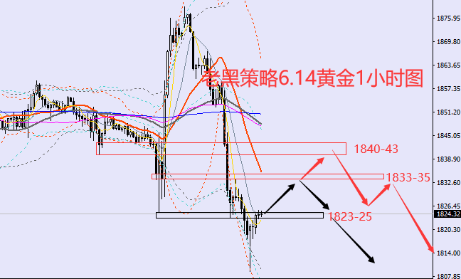 小时图上,受昨日暴跌影响,今日开盘后行情即出现一波再回落,跌至1810附近后回弹,目前回弹至隔夜首个回撤低点1825-23区域,短线市场消极情绪得到一定的缓和,但并不意味着行情就此反转回升,目前反转几乎是不可能的,有回升也仅仅只是技术性的超跌反弹,日内上方着重关注隔夜回弹高点1833-35一带压力测试,而主要的技术压力则关注此前高低点密集位1840区域。日内行情短线回弹确认压力后,大概率会再有回修,至于是否会跌出新低,技术上允许,但还是要看市场实际情绪影响。