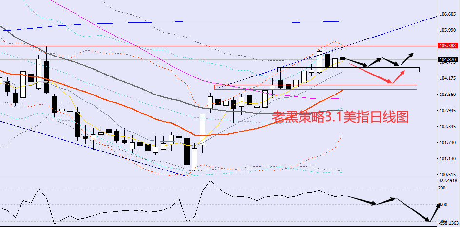 日内美指下方继续关注5日线104.8争夺,技术上美指仅经过一日阴线调整是不够的,所以5日线依然还是有跌破的可能,下方着重关注10日线104.4争夺,如果行情要表现偏强,能够稳住10日线即可,但不宜过早的再回升。如果偏弱,则跌破10日线,下找20日线103.8/7都是允许的,反倒这种走势更难有效的释放积压的调整需求,充分释放后,美指后期也才能有跟好的上涨节奏。