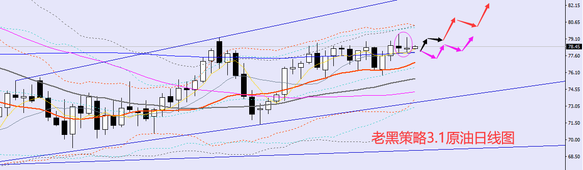 日线结构上,美油连续两日收得冲高回落阴星线,虽然此形态放在以往常规行情来看是略显偏空的,但是前两日阴星线又都站稳在5、10日均线之上,这一定程度上又是短线行情保持偏强的表现,所以这就导致今日行情走势会非常的难判断。如果继续守住5、10日线78支撑,则美油整体继续保持偏强,甚至可能会将结构重心继续不断的上抬,后期用时间工具去测试80压力的可能。而如果日内美油跌回5、10日线78以下,短线走势则会出现一定的变数,虽然下方还会有20日线77兜底,但是短线对于市场多头情绪还是会有一定影响的。总之目前美油整体是偏强的,行情多半还是会有震荡的方式保持偏强,至于何时再迎来上涨,就需要基本面的助力,即便没有基本面助力,短线美油也只是暂时性的调整,不会调整太多,所以美油的主线思路依旧看涨,以择低多为主。
