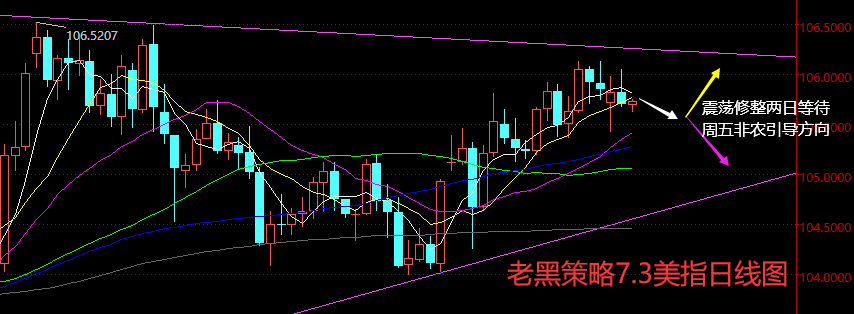 日线结构上,美指回到5、10日线下后,也将短线结构重心下移了,短期内进一步回修的可能性增加,下方可继续去关注20、60日线105.4-3一带。需要注意的是,周三、周四美盘休市,而在此期间,还有其他基本面事件,诸如美联储人员讲话,今晚的小非农ADP数据,都可能给市场带来情绪上的异常波动,所以今明两日务必要高度谨慎,做好足够的风险防范,尽可能等待周五非农数据后再做参与打算。