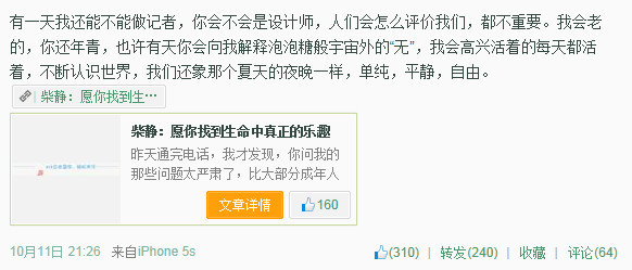 柴静没有个人账号,而关于她的最新动态都是通过“柴静看见”,这个她所写书籍的官方微博发布的。而就在两天前,这个账号曾发布这样一段文字:“有一天我还能不能做记者,你会不会是设计师,人们会怎么评价我们,都不重要……”有网友分析,这似乎在暗示柴静离职一事。