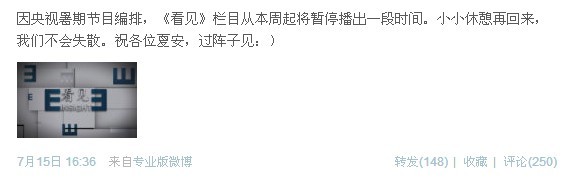 2013年7月15日这周,柴静主持的《看见》停播,当时的说法是因“暑期节目编排调整”,结果就这样,《看见》停播至今,原因不明。