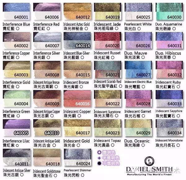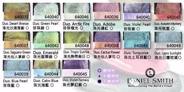 珠光色系只有DS一家独家量产,仅此一家绝无分店,是其他水彩厂牌无法代替的。就像是拿着眼影在作画,质地细致流畅,色彩绚丽,让人无法自拔。与其他颜料混合以及使用黑色的画纸,更能展现出闪闪动人的珠光色系。
