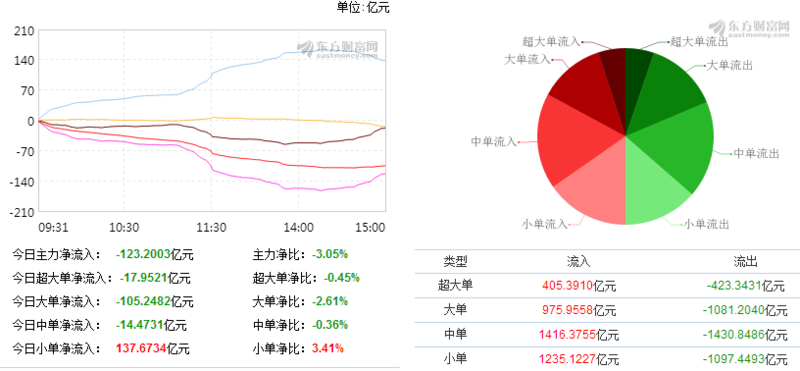 根据东财统计,截止收盘沪深两市呈现资金净流出的状态,当日沪深两市资金净流出123.20亿元。市场资金净流出减少。今日超大单净流出17.95亿元,大单净流出105.24亿元,中单净流出14.47亿元,小单净流入137.67亿元。后市市场能否脱离底部区域,做多量能成为关键,从资金面看场内资金做多情绪不高,仍处于谨慎状态,但后市场外资金会逐渐流入场内。