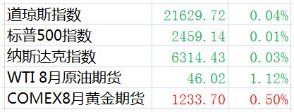 截至收盘,道琼斯工业平均指数下跌8.02点,报21629.72点,跌幅为0.04%;标准普尔500指数下跌0.13点,报2459.14点,跌幅为0.01%;纳斯达克综合指数上涨1.97点,报6314.43点,涨幅为0.03%。