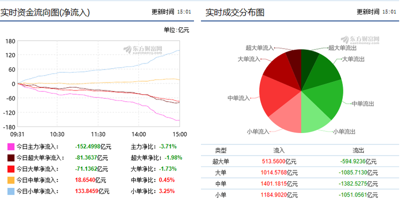 根据聚股票(巨丰投顾倾力打造公众号jugupiao)统计,截止收盘,沪深两市主力资金呈现小幅净流出状态,当日沪深两市资金净流出152.4998亿元。其中,超大单净出81.3637亿元,大单净流出71.1362亿元,中单净流入18.6540亿元,小单净流入133.8459亿元。从资金流向来看,主力资金呈现净流出状态。。