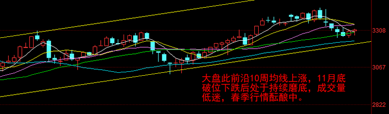 大盘此前沿10周均线上涨,11月底在多因素影响下破位下跌。现指数调整后持续低位持续震荡磨底,两市成交较为低迷。周线五连阴后市场上周出现反弹,本周走势较为关键。