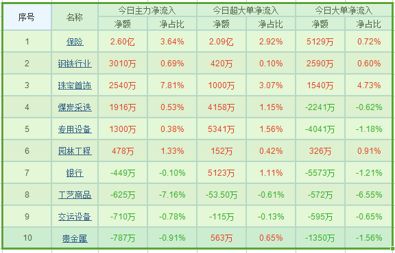 根据行业板块资金流向统计表观察可以看出:今日行业主力资金呈现多数净流入,其中,保险板块主力资金小幅净流入2.60亿元。钢铁行业主力资金净流入3010万元,珠宝首饰行业主力资金净流入2540万元,煤炭采选行业主力资金净流入1916万亿元。从个股资金流向来看,获得主力资金净流入排名前十情况如下: