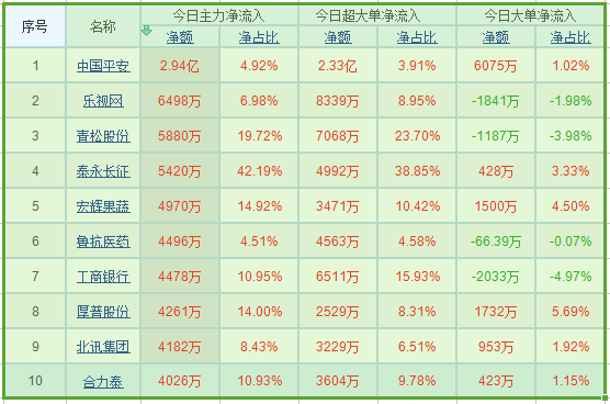 从今日个股资金净流入情况来看,中国平安主力资金净流入2.94亿,居个股净资金流入首位,其次是乐视网,主力资金净流入6498万,青松股份主力资金净流入5880万,泰永长征主力资金净流入5420万亿,宏辉果蔬主力资金净流入4970万。
