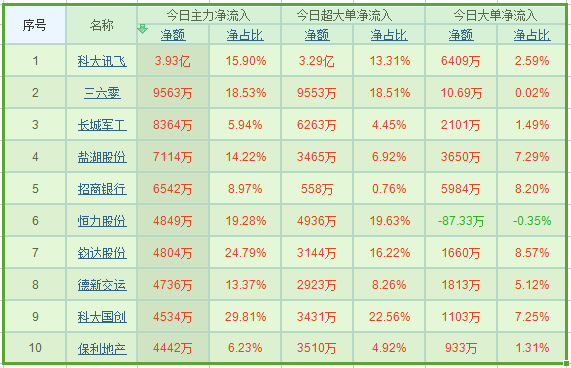从今日个股资金净流入情况来看,科大讯飞主力资金净流入3.93亿,居个股净资金流入首位,其次是三六零,主力资金净流入9563万,长城军工主力资金净流入8364万,盐湖股份主力资金净流入7114万,招商银行主力资金净流入6542万。