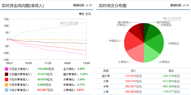 根据东财统计,截止收盘,沪深两市主力资金呈现小幅净流出状态,当日沪深两市资金净流出114.0940亿元。其中,超大单净流出31.4371亿元,大单净流出82.6578亿元,中单净流出9.4928亿元,小单净流入123.5877亿元。从资金流向来看,主力资金呈现净流出状态。今日资金净流入前十名行业情况如下: