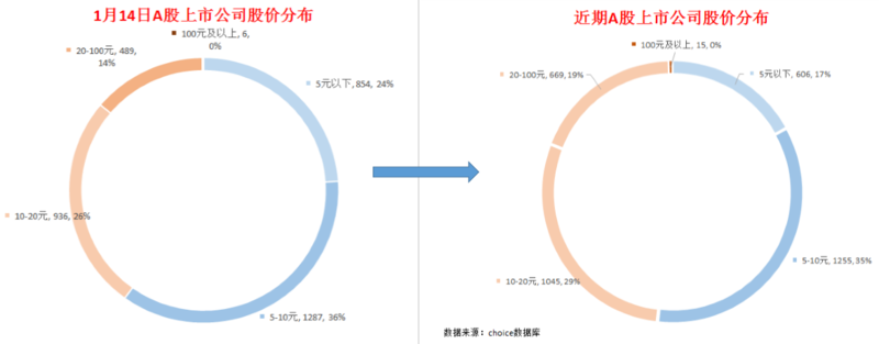 1月14日,A股涨幅还比较有限,5元以下低价股占比24%,目前已经下降到17%;5至10元股票,从36%略降至35%,基本变化不大;10元至20元股票占比略增,从26%增至29%;20元至100元的股票从14%增至19%,增幅最大;百元以上股票有15只,占比0.43%。总体来看,低价股占比下降,高价股占比上升,低价股仍占主要部分。