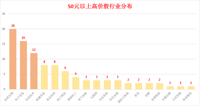 另外,从高价股和低价股板块分布看,医药生物、电子设备、信息技术三板块聚集了大量的高价股,正是目前市场的热门板块。
