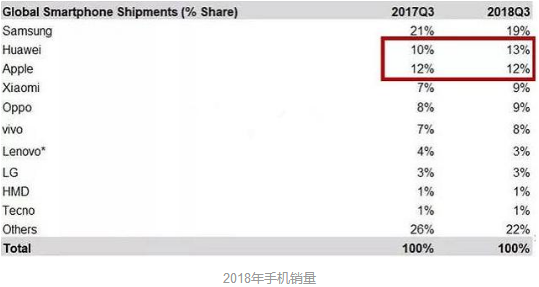 2018年头部手机供应商全球出货10.85亿部,其中三星位列第一3.14部,其次是苹果销量2.25亿,华为销售量第一次突破2亿。小米、OPPO、VIVO均有小幅增长。