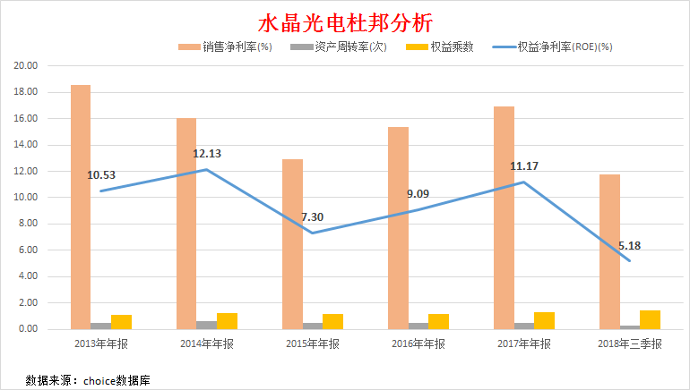 水晶光电近年来的净资产回报率不高,始终在10%上下,符合消费电子的平均水平,但低于优秀同行。18年Q3由于一笔投资收益导致净利润率上涨,使得18年的ROE有所上升,剔除后,ROE大约为5.18%,数据偏低。