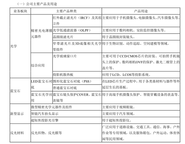 公司主营业务可以分为四类:光学、蓝宝石、反光材料以及包括新型显示的其他业务等。收入占比分别是:精密光电薄膜元器件80%;蓝宝石衬底10.6%;反光制品8.79%;其他:0.26%。