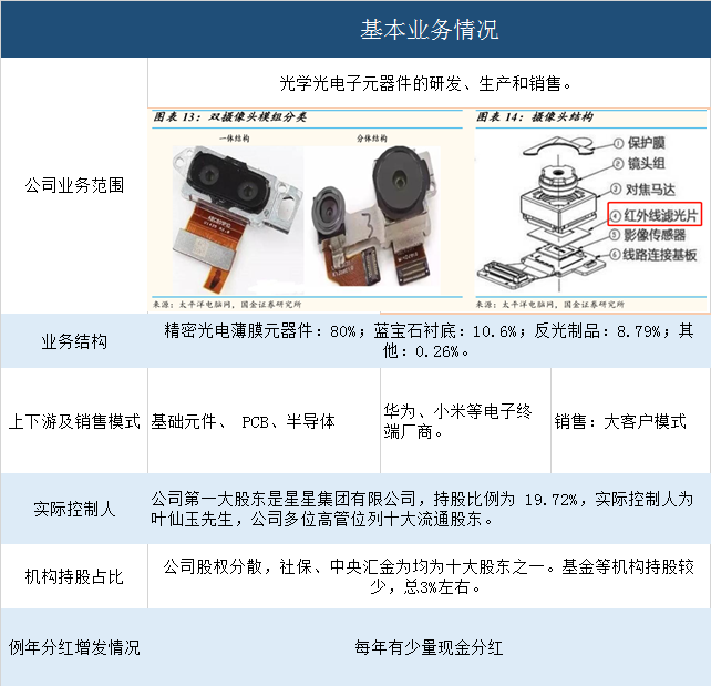 公司的收入主要来自于光学业务中的精密光电薄膜元器件,产品有红外截止滤光片IRCF 及其组立件、光学低通滤波器OLPF、晶圆级滤光片和窄带滤光片及组立件等,主要应用于消费电子产品、汽车、安防监控摄像头等。