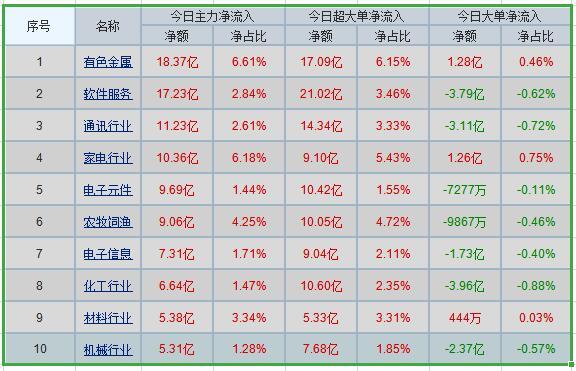 从两市行业板块资金流向来看,今日有色板块成为两市行业板块中主力资金净流入最大的行业,整个板块净流18.37亿,其次是软件服务产板块,主力资金净流入17.23亿,通讯板块主力净流入11.23亿元,家电板块主力资金净流入10.36亿元,电子元件板块获主力净流入9.69亿。从市场个股资金流向来看,获得主力资金净流入排名前十情况如下: