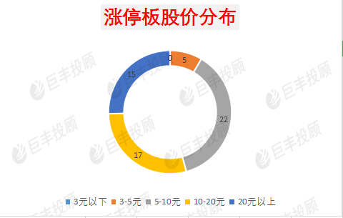 涨停股的股价特点仍旧不明确,虽然今天涨停股数量略有增加,但是3元以下的低价股病没有出现涨停,涨停股的股价还是集中在5元以上的个股中,从统计的结果看,10元以上的涨停股数量为32只,其中20元以上的涨停股为15只,10元以下的涨停股数量为27只,5元以下的涨停股数量为5只。