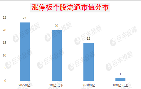 流通市值方面,今天的涨停板流通市值大多保持在百亿以内,只有一只涨停股的流通市值在百亿以上,50亿以下的流通市值仍是涨停股的密集区,共出现43只个股涨停,其中20亿以下流通市值的涨停股数量为20只。由此,中小流通市值的个股仍是资金的最爱。
