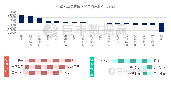 巨丰数据赢统计:7月4日龙虎榜个股共涉及17个行业,其中有8个行业呈现净流入状态,共流入4.61亿元,前三行业分别为,电子 [ 净流入 1.43亿元 ] 、国防军工 [ 净流入 1.25亿元 ] 、公用事业 [ 净流入 0.95亿元 ] 。有9个行业呈现净流出状态,共流出-3.96亿元,前三行业分别为,通信 [ 净流出 -1.73亿元 ]、食品饮料 [ 净流出 -0.46亿元 ] 、电气设备 [ 净流出 -0.39亿元 ] 。