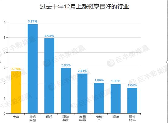再从过去十年,12月份市场的表现看,整体还是上涨的,而从上涨的行业板块看,几乎都是来自权重板块,非银金融、银行、房地产、钢铁,这些都是属于蓝筹,而这些板块的异动对市场的走势有着较大的影响。同时从这些行业的属性看,都是一些估值较低,但是盈利能力较强的行业,所以这些行业也是机构或是外资比较喜欢的。
