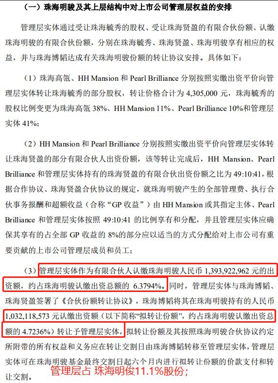 格臻投资持有GP珠海明骏41%的股权,并作为LP出资6.3794%参与股权收购案。另外,格臻投资与另一LP珠海博韬签有协议,将10.32亿收购其持有的4.7236%出资份额。如此算来,格力管理层此次参与股权转让,将出资11.1%,最终持有格力电器1.665%的股权。