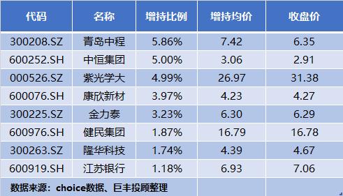 具体看,上周增持比例超过1%以上的个股共有8家,其中青岛中程和中恒集团都被大股东累计增持超过5%以上,增持力度排名靠前。