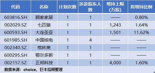 除了上述几家已被大股东增持的个股外,上周还有7家上市公司的大股东发布了增持计划,或许是大股东看来公司未来发展的信号: