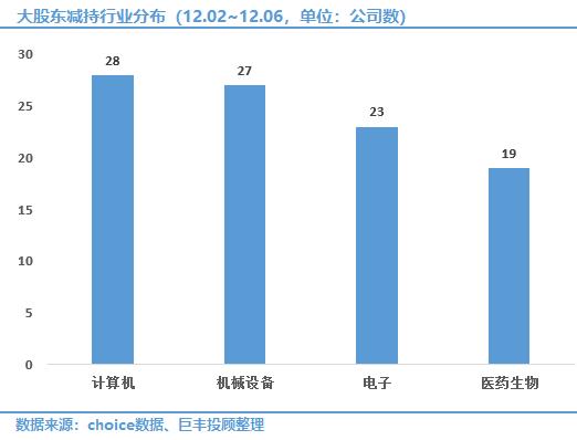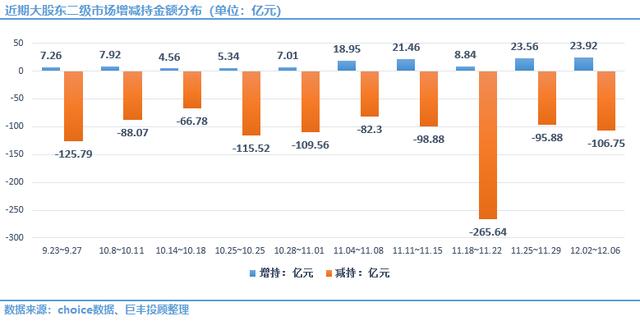 据巨丰数据赢统计,上一周(12.02~12.06)沪深两市一共有35家上市公司被大股东通过二级市场进行增持,且增持金额合计23.92亿元,较上周小幅回升。减持方面,上周共有208家上市公司被大股东减持,减持金额为106.75亿元,减持规模有所增加。
