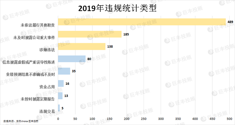 从违规类型上看,最多的是未依法履行其他职责,共489次,其次是未及时披露公司重大事件185次,涉嫌违法138次,信息披露虚假或严重误导性陈述有80次,业绩预测结果不准确等违规行为次数相对较少。