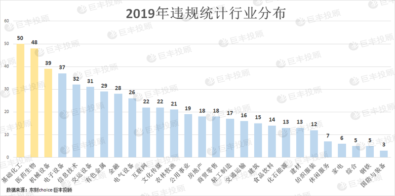 从行业上看,基础化工、医药生物、机械设备等行业是违规最多的三个行业,分别有50家、48家、39家;另外电子设备、信息技术、交运设备等板块违规公司也较多,分别有37家、32家和31家;家电、综合、钢铁、国防设备等板块违规数量较少。