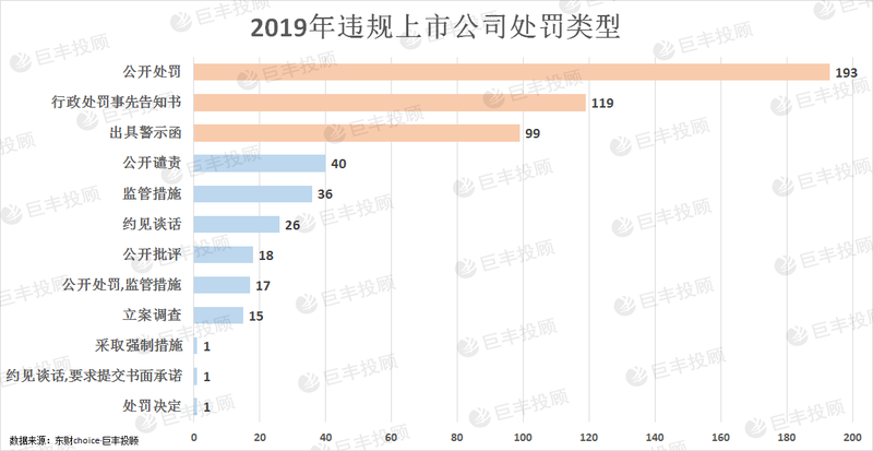 从处罚类型看,对193家A股公司处以公开处罚(主要是罚款)、对119家公司出具行政处罚事先告知书、对99家公司出具警示函、对40家上市公司公开谴责、对36家公司采取监管措施、对26家概念股是约见谈话等。另外对对15家公司采取立案调查,对1家上市公司采取强制措施。