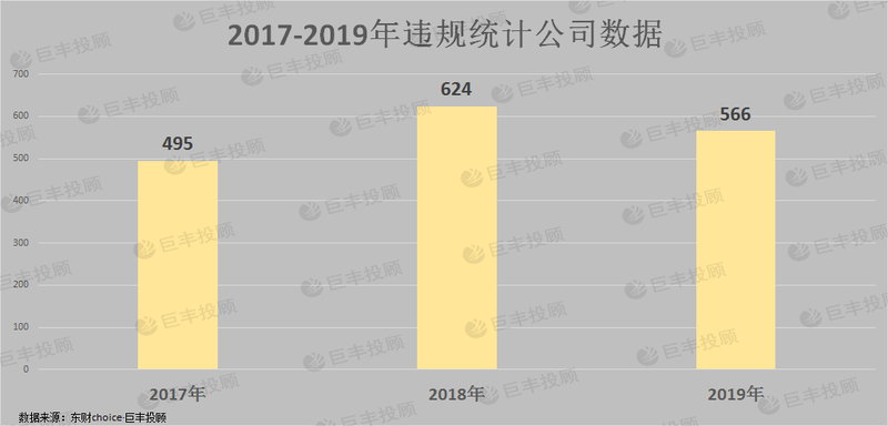 从公司统计看,2019年A股违规公司达到566家,占全部A股的15.09%。相比2018年624家的数据,下降了58家,同比下降了9.29%。但比2017年495家,增多了71家,增长了11.95%。